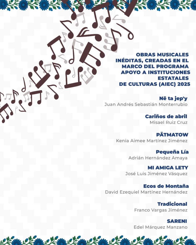 A las 10:00 horas en la cancha municipal de Villa Hidalgo Yalálag, se efectuará el concierto de clausura del taller Cantos Nuevos de Oaxaca, un proyecto de composición musical desarrollado en colaboración con la Secretaría de Cultura de México. En este encuentro, el público podrá escuchar obras originales creadas por compositoras y compositores oaxaqueños.